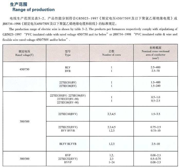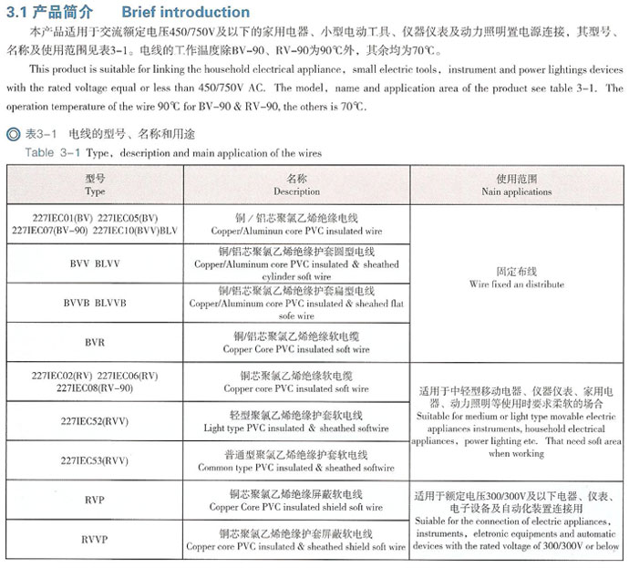 本產(chǎn)品適用于交流額定電壓450/750V及以下的家用電器、小型電動(dòng)工具、儀器儀表及動(dòng)力照明置電源連接,其型號(hào)、名稱及使用范圍見表3-1。電線的工作溫度除BV-90、RV-90為90℃外,其余均為70℃。