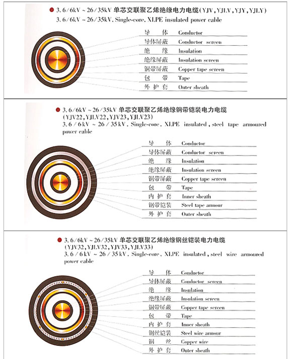 26/35kV 單芯交聯(lián)聚乙烯絕緣細鋼絲鎧裝聚氯乙烯護套電力電纜(YJV32,YJLV32)