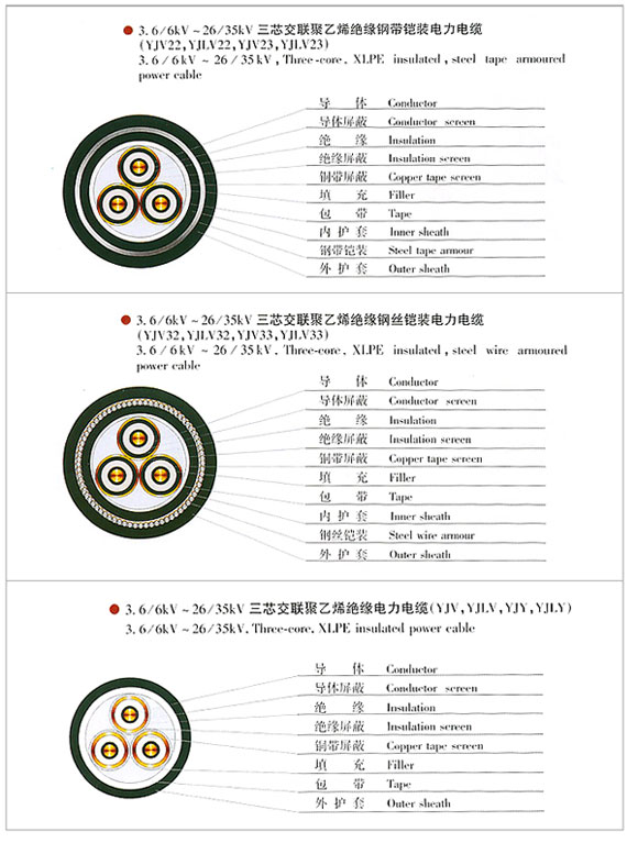 26/35kV 三芯交聯(lián)聚乙烯絕緣鋼帶鎧裝聚氯乙烯護套電力電纜(YJV22,YJLV22)
